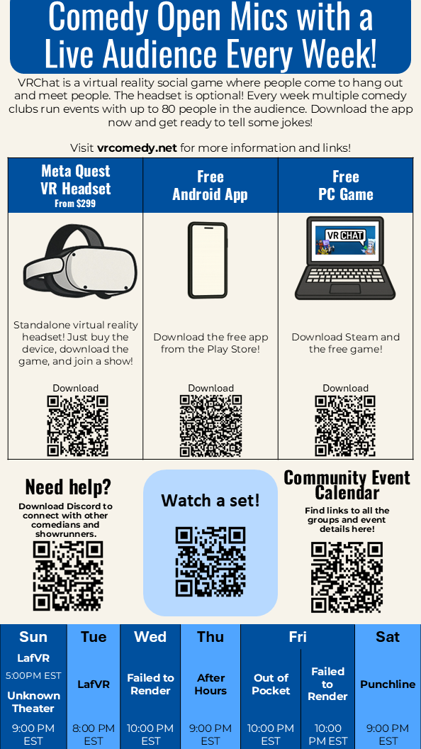 Throughout the year, we host special comedy events like tournaments, themed nights, and collaborative shows with other VR communities.